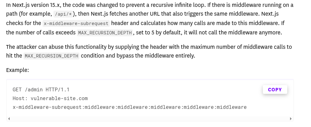 I searched for “Next.js auth bypass” and landed on a Datadog writeup that looked relevant - one section there jumped out as especially useful:
