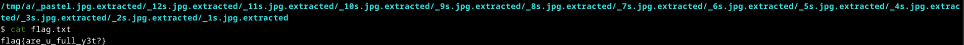, which felt like a clue. I figured it probably meant I needed to extract it 12 times. After repeating the process 12 times, the flag finally popped out.