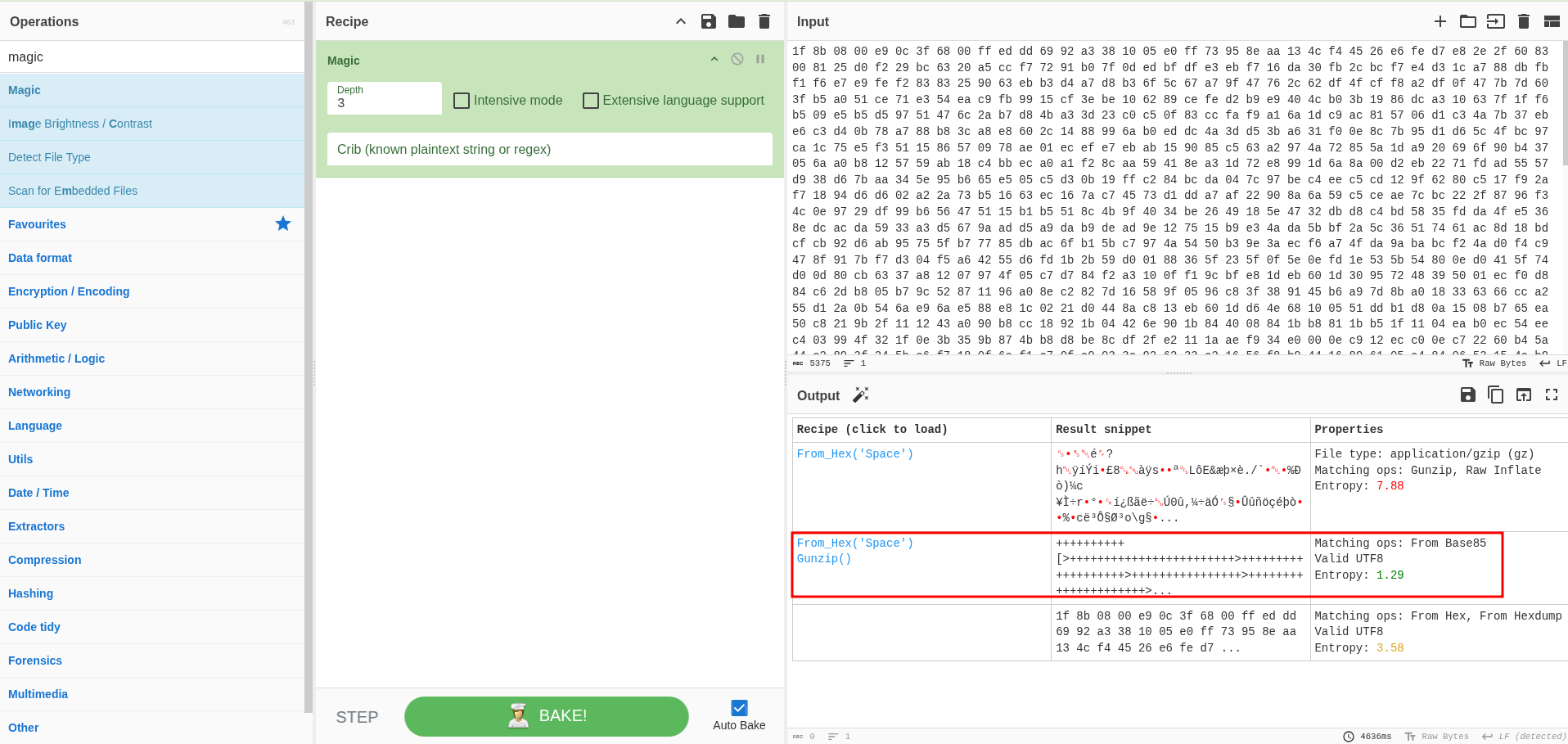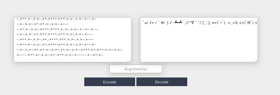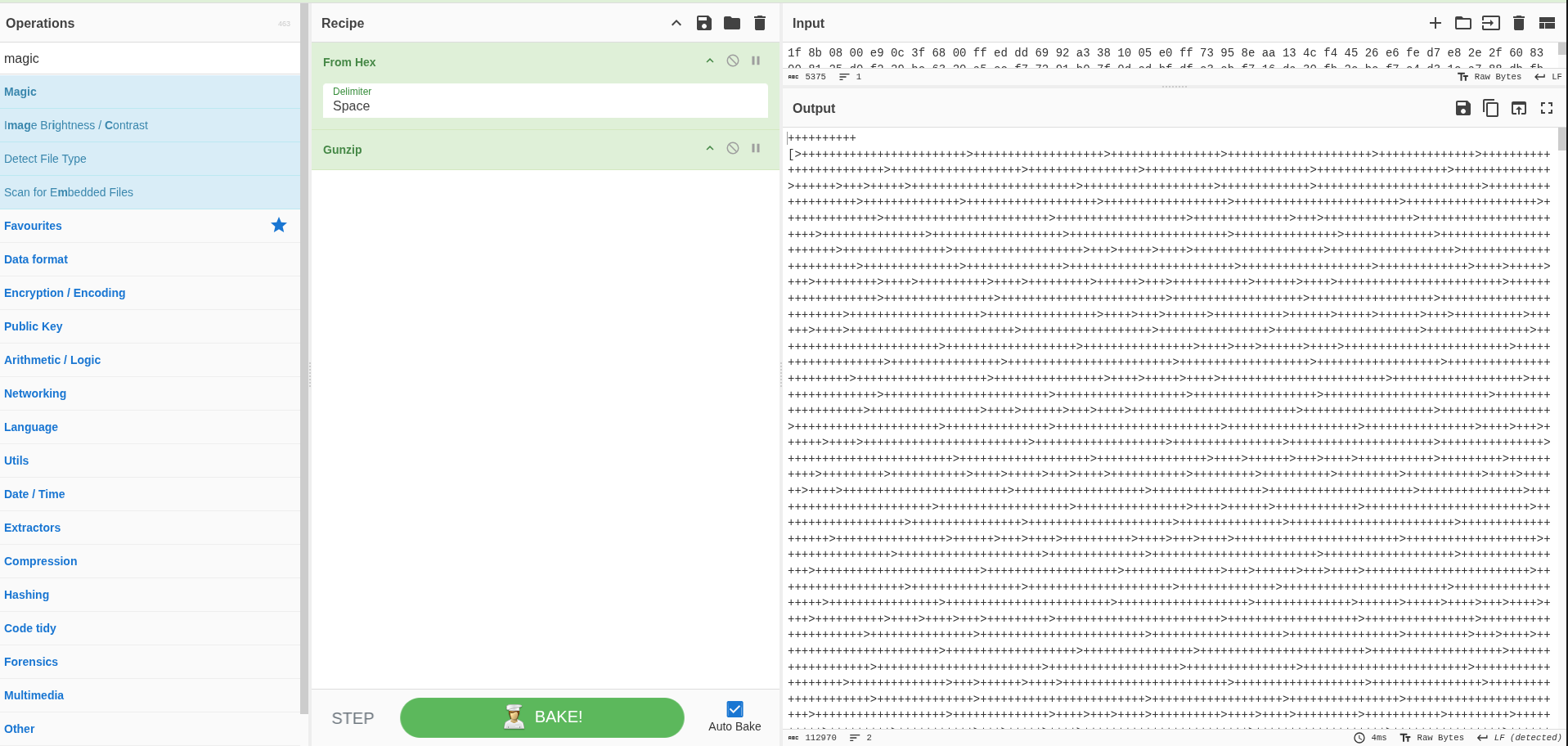 Using that same recipe, I confirmed it was indeed Brainfuck. I saved the output and ran it through an online brainfuck interpreter, which gave me the next layer.
