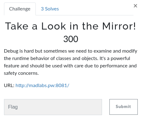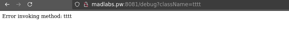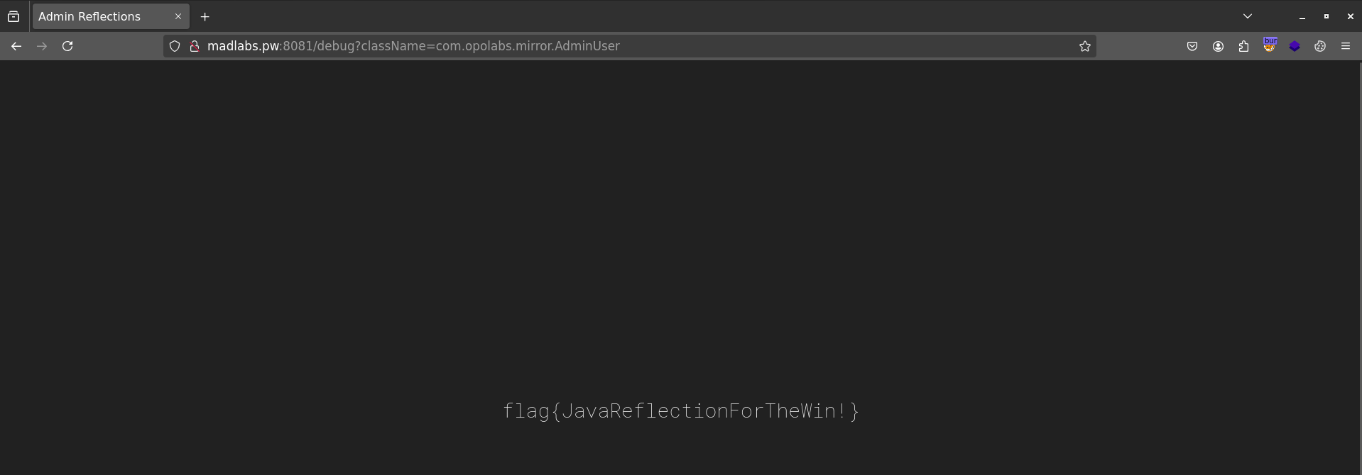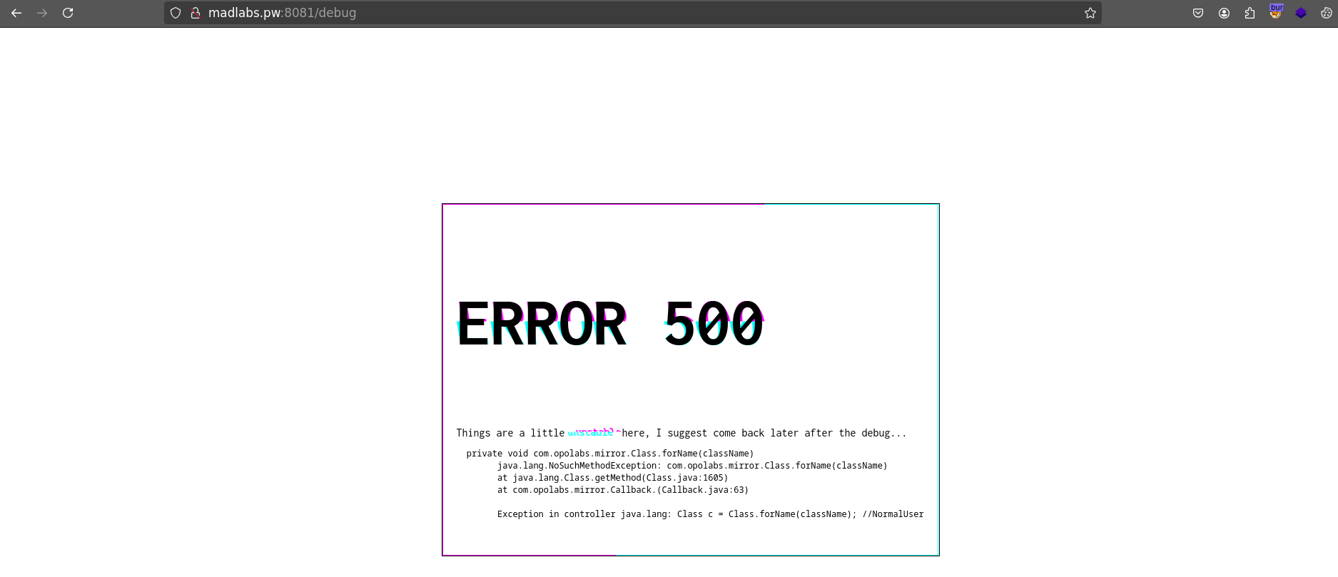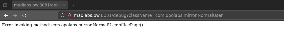 After some testing, I tried callinghttp://madlabs.pw:8081/debug?className=com.opolabs.mirror.NormalUser