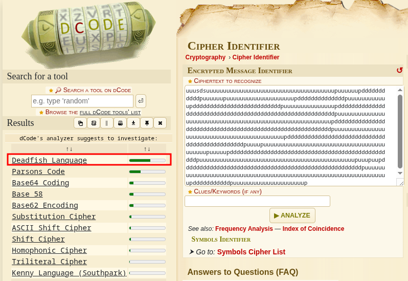 I pasted the encrypted text into the tool, clicked analyze, and it suggested that the text is written in Deadfish.