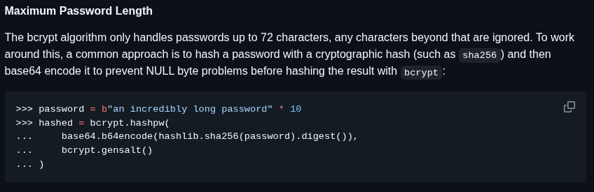 If I create a password with 72 characters, I can log in using that password plus extra stuff. But the code shows that a PEPPER