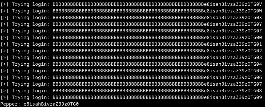 - Repeat the login attempts using the previous password + known PEPPER characters + a new character.
