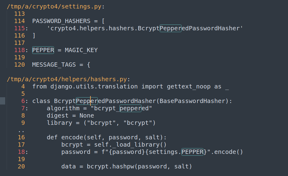 is added before hashing, so bcrypt_hash(password + PEPPER)